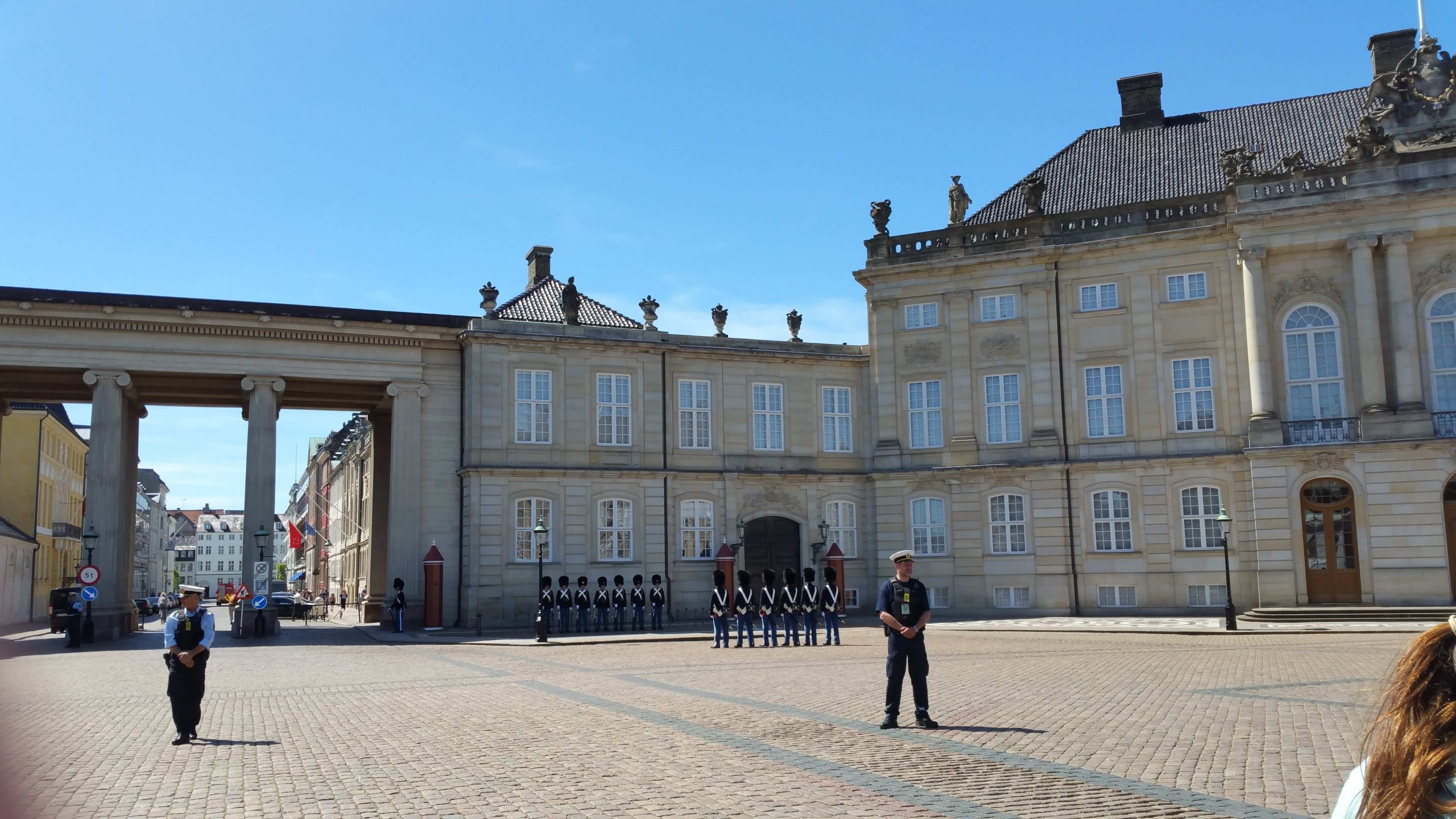 我們到達阿美琳堡皇宮,正巧是十二時正,看到皇宮守衛士的交接班儀式。只見一隊守衛士從皇宮一邊神采奕奕、鬥志昂揚,踏著像儀仗隊一樣整齊有力的步伐走來。每到一道門口,新到的換下原來的。這時氣氛熱鬧至極,站在大廣場邊的觀眾爭相攝下那莊嚴肅穆的鏡頭,以作永久紀念。