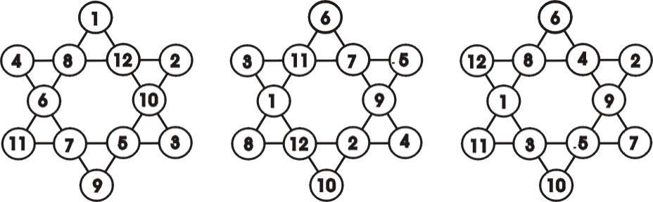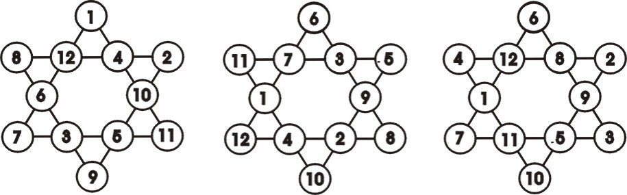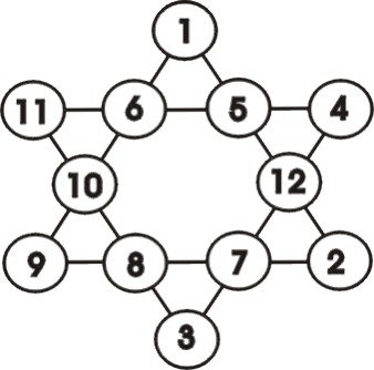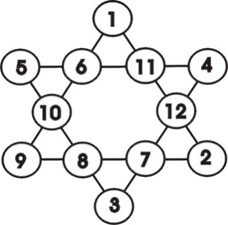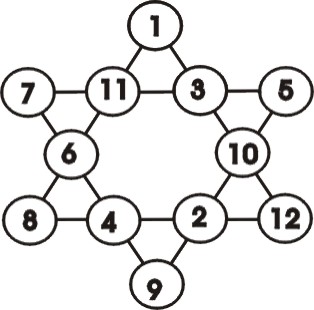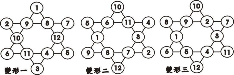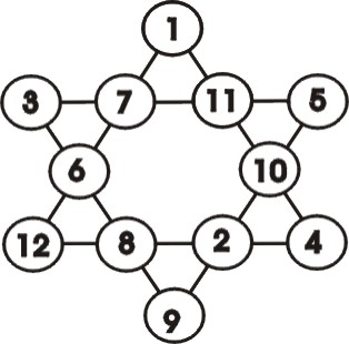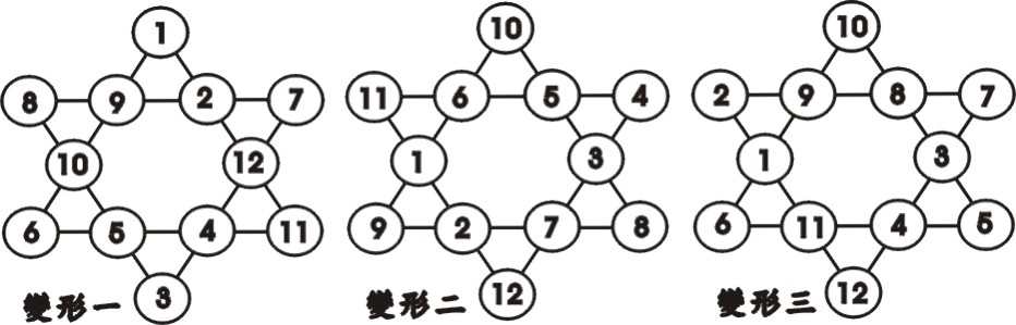 將第一組中組成之奇數 7,11,3,5 及偶數 8,4,2,12 順次由左至右放置在第五邊及第六邊(圖十四)上各空位中(奇數在上,偶數在下)所成之排列如圖十五所示,是為此型合於條件排列之一。