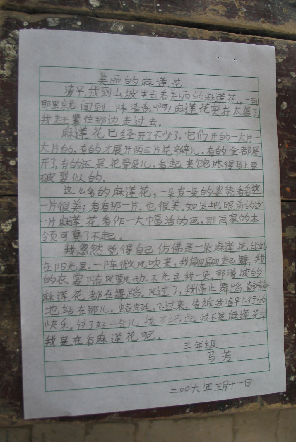 在回訪石大倉鄉時,我們又和好多老朋友見面了:團縣委的潘海春書記、王梅小姐、張海明先生已在化隆縣的路旁等候。大夥上山後又會同了石大倉鄉領導們一齊來到了大嶺村的學校。孩子們見到訪客的到來好興奮,這已是我們第四次來看他們了,二年來孩子們長高了,活潑了,想必學習也進步了。馬老師好親切好開心,可是他…他有點蒼老了,我們心中有點淒淒然。接著孩子們在操場上載歌載舞歡迎我們。當我們參觀教室了解學習情況時,在黑板上看到用粉筆寫的大字「熱烈歡迎遠方情人送溫暖」,真令人感動這所學校的師生情義!在教室裡我們看到了三年級孩子的作文,寫得好極了,真切極了,感人極了。我們隨手攝相下來三篇準備和季刊的讀友前輩們分享。一篇是馬芳的「美麗的麻蓮花」,一篇是馬艷的「老師,你聽我說」,另一篇是冶五花的「我的煩惱」。