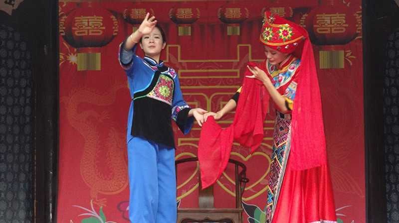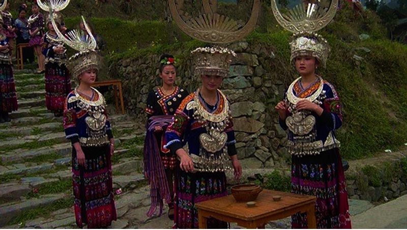 接著我們遇上了一齣路邊的野台戲 — 苗族的《哭嫁》。待嫁新娘的唱腔極為哀婉悲淒,配樂更是迴腸盪氣、不絕如縷。雖然我們不通苗語,但仍感受到那難分難捨的離情。一旁的小廖解說道:「苗區交通不便,又有土匪、野獸、妖怪、樹精,女孩子一出嫁,很可能此生再也不能回家見著爹娘了。而且苗族女子在家中沒地位,女兒到夫家後的遭遇,爹娘怎能不擔心呢?剛才的唱詞中女孩感謝了爹娘的養育之恩,接著述說她對嫁到夫家的恐懼,千山萬水,不知何日再相見。親爹默默無語,親娘老淚涔涔,安慰女兒到夫家後要勤快、順從、忍耐、勿多話,勿以爹娘為念,一切聽從天命。」