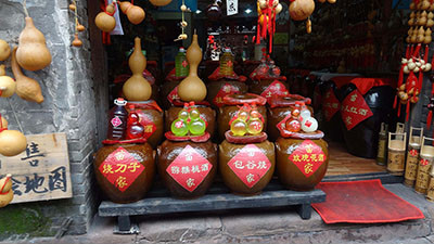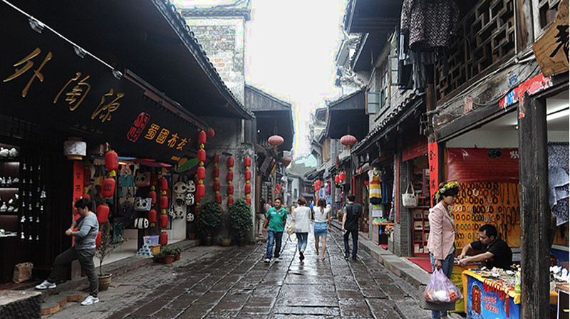 鳳凰古城的街道乾淨清潔,雨後的石板路更是光可鑒人。苗族喜好銀飾,女孩子除了銀項練、銀手鐲、銀指戒、銀耳環、銀腳環、銀披肩外,最為特別的是她們頭上帶的「銀巢帽」,故此地的銀莊特別多。據店家說:「一頂普通的銀巢帽需耗銀三十兩,講究的就得五十多兩,製作工藝極其考究,將銀片打造成各具情態的花草蟲魚、飛禽走獸,以銀絲相串。走動時叮噹作響、搖曳生姿;銀帽頂端鑲上銀質長羽一對,狀似牛角,映日生輝。銀帽邊沿懸吊一排銀質花苞,下緣齊眉,星月燦然,銀帽後背……」
