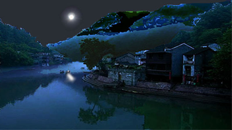 靜謐的沱江,流水潺潺,在驟雨初歇後的月色映照中,真個令人感到千江有水千江月啊!「灩灩隨波千萬里,皎皎空中孤月輪。」嗯,已不知經過幾世幾代了,月,依然如舊。「夜闌風靜縠紋平」,此情此景,難道我亦該步蘇大學士後塵,而「小舟從此逝,江海寄餘生」麼?我茫然了……