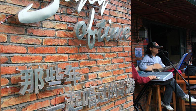 白天的古城與夜間大為不同,沒有夜間的喧囂,但見在路旁彈唱吉他的藝人和在吧廳暫駐的流浪歌者。藝人多為單獨一人,也有兄妹檔或情人檔的。吧廳只提供場地,不付薪資,全靠客人打賞為生。我不知這些流浪歌手,他們能靠此營生嗎?他們真心熱衷歌唱嗎?他們喜歡流浪嗎?他們心中也孤寂嗎?他們人生的下一驛站又在哪裡呢?在「虹橋」下很詫意地聽到了一曲我熟悉的老歌「野百合也有春天」,歌聲磁性感人,顯然歌者情感已深度投入。曲罷後我趨前相詢,歌者親切和靄、彬彬有禮,不似職業歌手的油腔滑調,但她不願多提她的過往未來,只靦腆一笑。當我送上「感謝金」時,她起立深深一禮,臉都紅了。