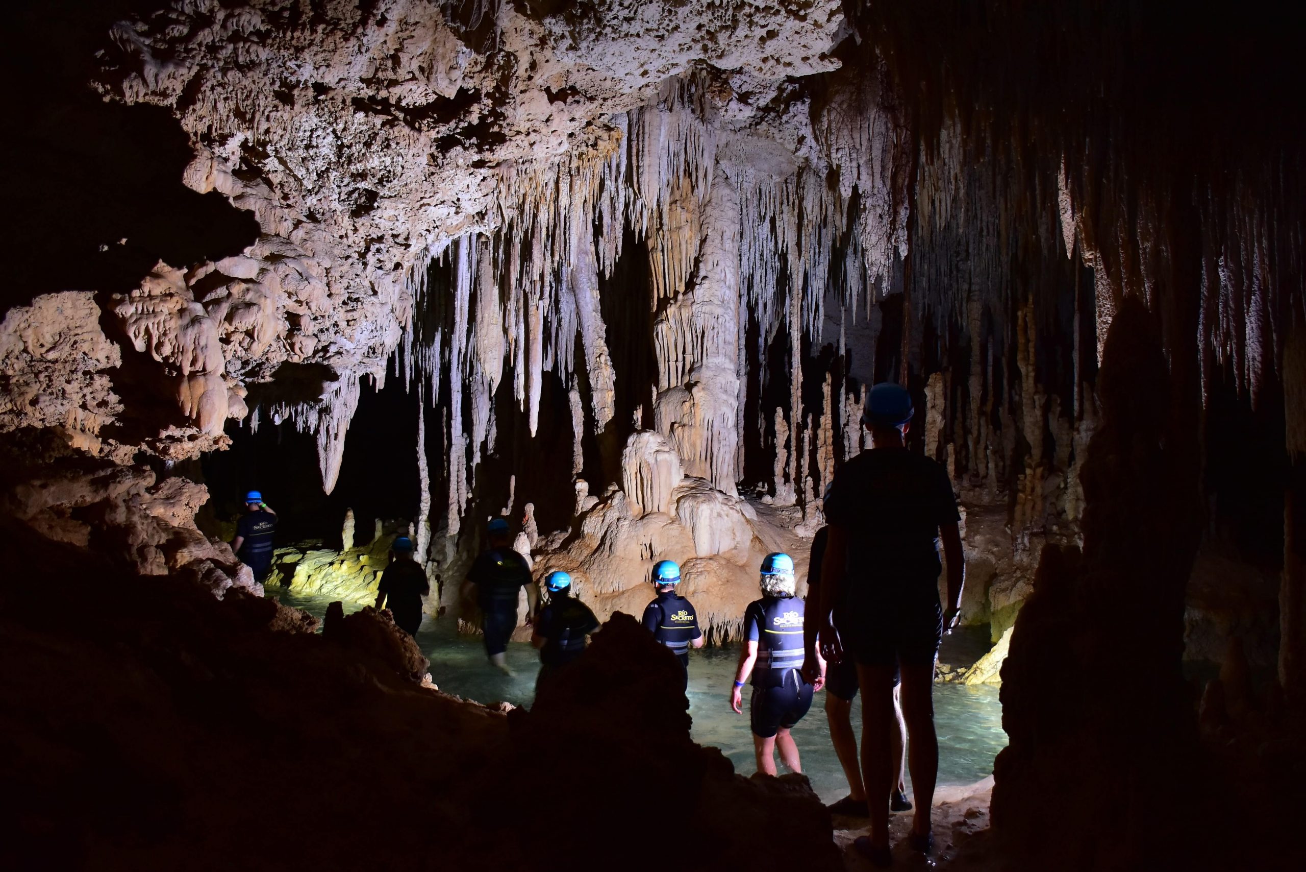 這裡的熱鬧景點還有 Underwater Cenotes,遊客慕名趨之若鶩,別有一種讓人產生夢幻般的滋味。我們去了一個山洞(Río Secreto),令人難以忘懷。洞中有地下河流,遊客進洞,得頭戴安全帽,身穿救生衣,走過水深及肩的泥濘路,入水中與水搏鬥,驚喜有趣。洞中水草倒垂,似冰柱閃光,賞心悅目,美不勝收。