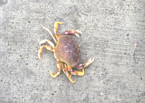 我開頭拋投數竿,起初總感到有點礙手礙腳的不盡如意,所以一直釣不上蟹兒,心中頗為納悶。後來才發現釣組太輕,被風浪沖著不能著底,於是我立即加個 五十克鉛墜後,十一點多時,果真時來運轉,我一提竿手感十分沈重,判斷這下可能有東西了!當我將釣組收至水面時,往下一瞧,果真是一頭不小的珍寶蟹,其十隻蟹腳不停地於水面上划來划去。因女兒怕風,當時正躲進車內避風,無人幫忙。我立刻請鄰位的老外幫助搖輪,自己用雙手快速收線。做夢也沒想到,在將要關閉釣珍寶蟹的前四日,於這世界著名的帕西菲卡碼頭棧橋上,幸運地釣到了生平第一隻名聞天下的太平洋珍寶蟹,而感到無比的興奮和自豪。老外看我釣上的是個不小的珍寶蟹,意欲幫我拍幅開門紅的圖片當作紀念,因筆者不喜歡拍照,我向老外說了聲半生不熟的英文:「No, thank you.」被我婉拒了。老外又熱情地拿出卡尺幫我量長度。他說聲:「No!」我知道糟了,長度達不到六英寸。我趕緊把可愛的珍寶蟹放在地上,單獨給它拍照後,就放生與它拜拜了!