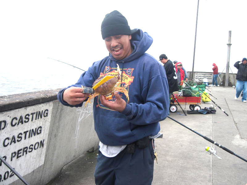 這裡是太平洋海洋性氣候,即使是夏日炎炎的六月天,海邊依然寒風襲人,海浪滾滾。到此釣珍寶蟹者,多是身著冬衣,但也有不少釣者,不畏寒冷,依然夏衣貼身,精神振奮地拋竿於大海與人試比高。也有全家傾巢而出,瀟瀟灑灑十分浪漫地於棧橋上愉悅地渡個週日。他們不管獵獲有多少,個個面帶笑容,盡情地享受著釣珍寶蟹的樂趣。運氣好的釣手,釣上幾頭長度達標的蟹兒,帶回家做幾道蟹宴,閤家盡情地美餐一頓,必定回味無窮無盡。