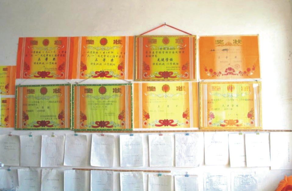 馬校長和藹可親卻風骨嶙峋,愛心辦學卻要求嚴格。看到每間教室後方牆上的「學習園地」和老師辦公室裡掛得琳瑯滿目的省、縣教育單位頒給該校的獎狀,我很欣慰,也很感慨。憶及四年前初次來此校勘訪時,孩子們沒有教室,就在民房前的空地上學習。遇上雨天或下雪,他們就搭個「塑料棚」權充教室,想到就令人鼻酸。