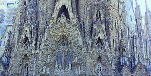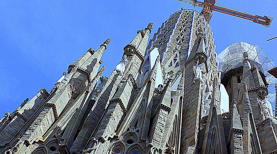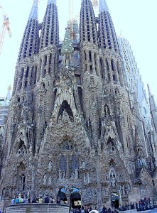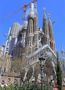 聖家堂建築奇特,為必看之首選,但遊人眾多,需預約,這可上網完成。從 1882 年開建至今,從未完工過,衝天吊車伴隨教堂尖頂,相依提升近百餘年,堪稱世上佳話。教堂平地突兀而起,外壁及圍欄有眾多塑像,而以東、西兩側為主。