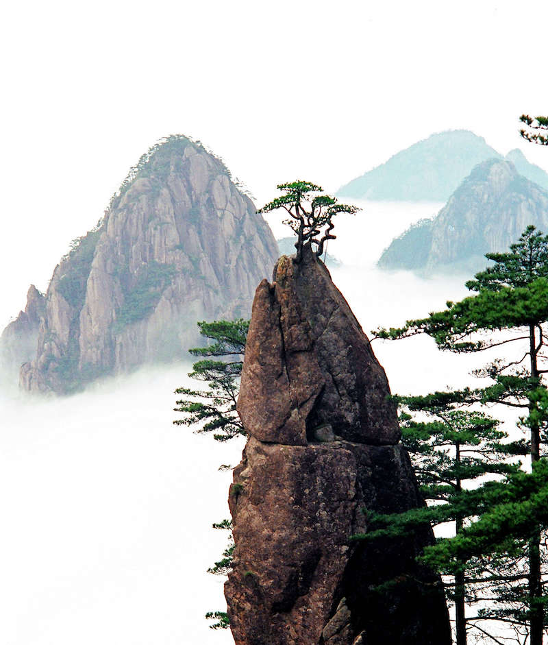 我在一九九四年四月某日下午六時左右,用尼康相機拍下了這幅作品(是用 200 mm 長焦,8 光圈,1 秒速度,100 度膠卷)。瞧!無垠雲海中,山峰屹立;畫面右側,松樹挺拔。整體層次分明,前後虛實呼應,把生花的御筆這一主體,淋漓盡致地呈現在你的眼前!