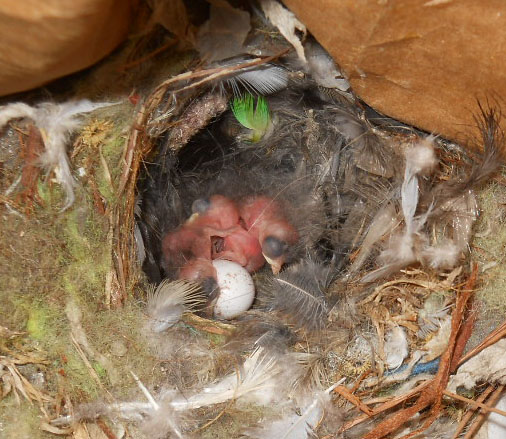 5 月 26 日是 Memorial Day,休假一天,也就有更多時間去親近他們。早晨卻發現夫妻倆圍著「小家」不停的跳來跳去,打開陽台門的第一件事是先去瞧他一眼。這一瞧,夫妻倆已打破往日的恬靜發出「嗤—嗤—嗤」的聲音在向我抗議。不看不知道,一看讓我驚喜一跳,二隻已破殼而出,屁股還連著小殼上。能選擇這一天破殼而出,視為巧合。到下午三點,四個 baby 紅的透明的身體,緊閉著兩個青藍色的大眼睛,相互搭疊在一起。從今天開始,這對夫妻將挑起生活的重擔,任勞任怨地去喂養四個嗷嗷待哺的小生命。為了減輕這夫婦倆的負擔,我挑選了一個漂亮的小盤子,裡面放上蛋黃和米飯等,又在一個精緻的小杯裡放進水。「漂亮」與「精緻」的目的是引起他們的注意和增加食慾。老公反對我放雞蛋黃,怕他們患上高血脂症。一天麻雀聞味而至,叼起一塊雞蛋黃立即飛到樹上與其他麻雀「口講指畫」通報信息,不出所料,四、五隻麻雀開始偷襲,小盤子一下精光光了。見此狀,我必須發聲,否則這斯文的夫婦倆就沒吃的。我生氣的指著麻雀:「偶爾來一個吃了就算了,結果你們來了一群,你們應該學會『口留三分香』,懂得 Share。」