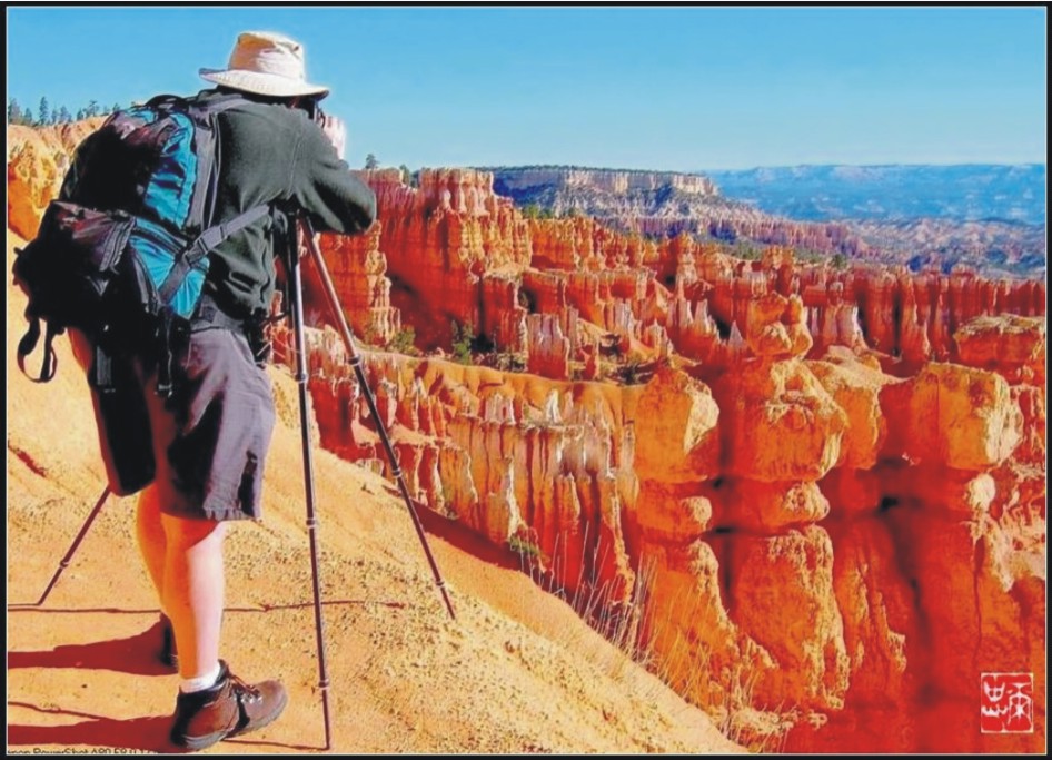 這幅照片,是在猶他州布萊斯(Bryce)國家公園內抓拍到的。照片展現了一位攝影者,在著名景點採訪中的神情。這幅照片,保存在我的相冊內已有好幾年了,倒不是它有什麼特殊的攝影藝術價值,而是在於它每次都能帶給我許許多多愉快的回憶。