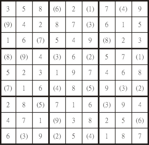 (2)縱向九行,每行九格中,從 1 到 9 每格 一數,次序不拘,但不重複。