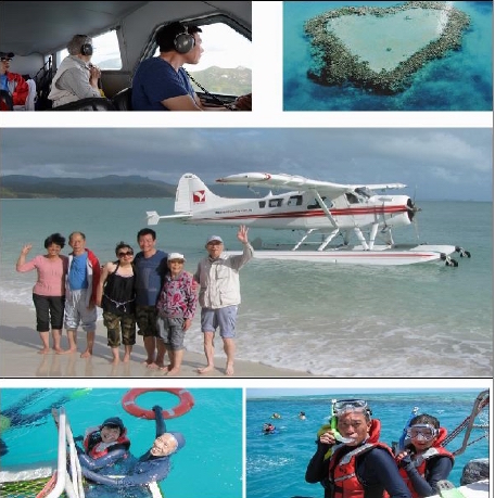 最精彩的,當屬去水上飛機場進行一次前所未聞的「水上飛機經典面貌全景遊」。 我們乘坐的水上飛機總共可坐七位客人(我們共六人),它可在短跑道上起飛,又可在深的海水中前進,在空中飛行也很平穩。不過,艙內聲音較大,客人都需戴上飛行耳機,才可避免不適。飛機升空後,在著名的大堡礁上低空飛行,讓大家近距離飽覽各種海洋小景:碧藍清澈的海水,彎彎的海岸線白浪滾動;最讓人難忘的是在一處淺水中,居然有一個完整的「愛」的圖型(圖二:上右)。在這約十公里的低飛中,你看到大自然創作出的美術作品真是數不勝數,讓人拍手叫絕!