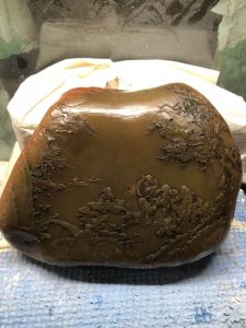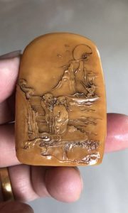 田黃石珍貴,刻工在石皮上刻上淺淺的人物、山水,為的是不浪費石頭的重量,因為一克在一萬元以上。好雕工的作品,細緻度比國畫傳神、耐看;因為石雕刻工立體,四面皆畫,石質溫、潤、凝、膩可以把玩,不用保養,百年不壞,可以傳世。一石在手,相伴一生。