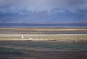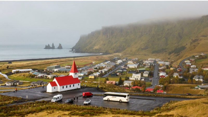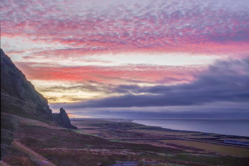 迪霍拉里(Dyrhólaey)位於冰島南岸,是一座一百二十米長的狹長半島,也是一座天然海蝕拱門岬角。半島上矗立著一座古老的燈塔,每逢夏季,海鸚等海鳥回歸的日子,這裡也成為冰島的觀鳥勝地。我們去的那天,海面濃霧彌漫,海中的岩石若隱若現。返回時天空放晴,遠方的河流、山嵐與原野中的房屋如被七色彩帶環繞,蜿蜒小路上的人和金色的草地好似一幅靜謐的油畫。