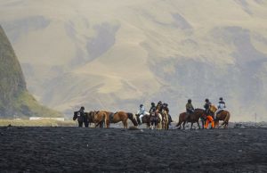 傍晚,我們走到住處附近的黑沙灘等待日落,可惜烏雲密布,驚濤拍岸。只好調轉鏡頭拍攝後面的山丘和騎馬的人們。