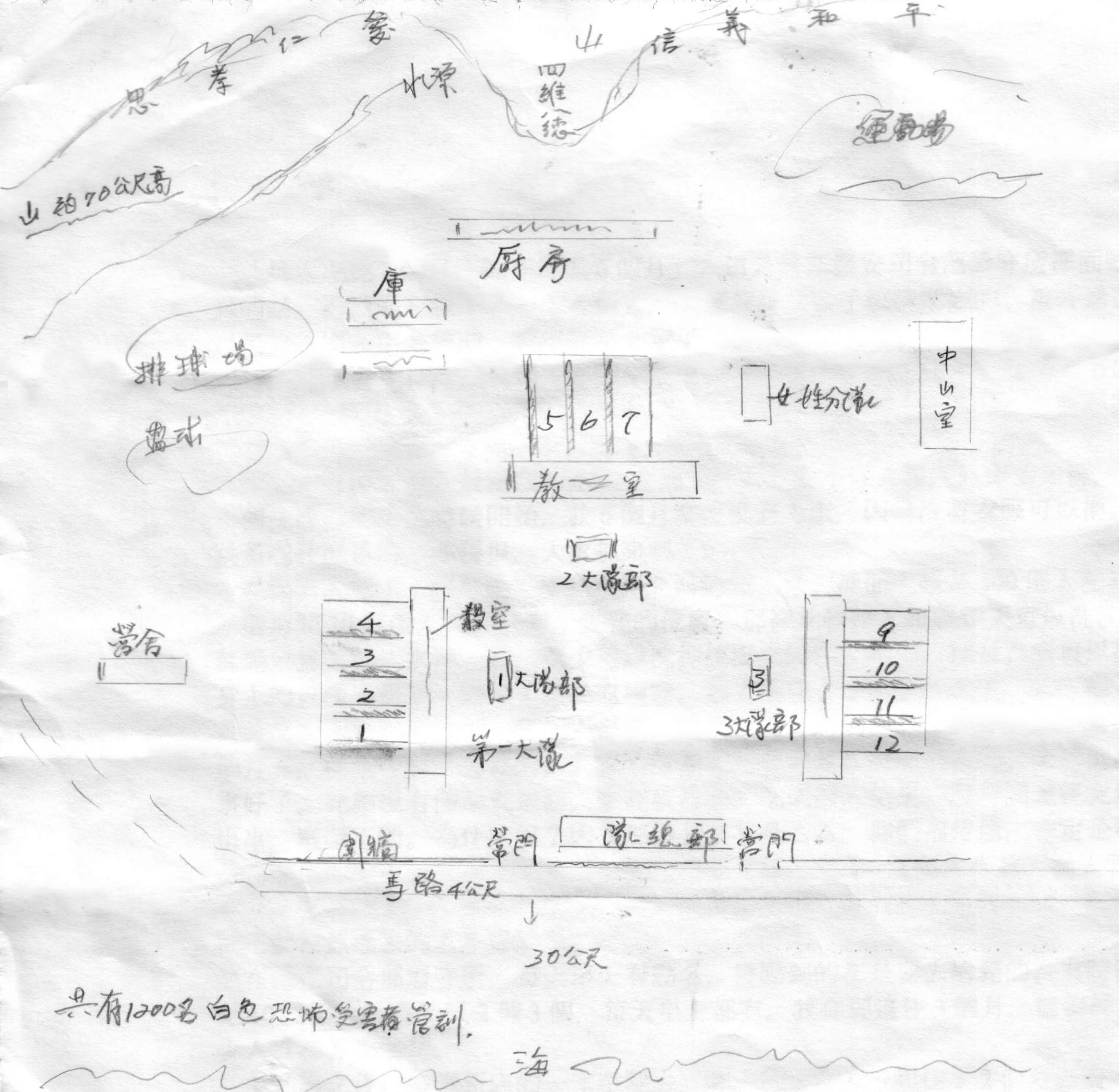 綠島的編制一共是三個大隊,十二棟營舍,每個中隊有一百四十多人。三個大隊裡面,第一大隊和第三大隊都是四棟營舍,只有第二大隊是三個營舍,另外加上一個獨立的女生用的宿舍。第三大隊是反共義士,韓國回來不聽話的都在那邊,人數不多,大概幾十人吧。我們和他們不能講話也不能碰面,隔離的很遠。我被編在第二大隊第六隊。第五隊大部分都是被判刑十年以上的人,第七隊中判刑十二年以上的人比較多。我是五年,在第六小隊,屬於可以比較早畢業的。一開始說的被「馬馬虎虎、糊裡糊塗」管訓的人,也有一些在第五隊。