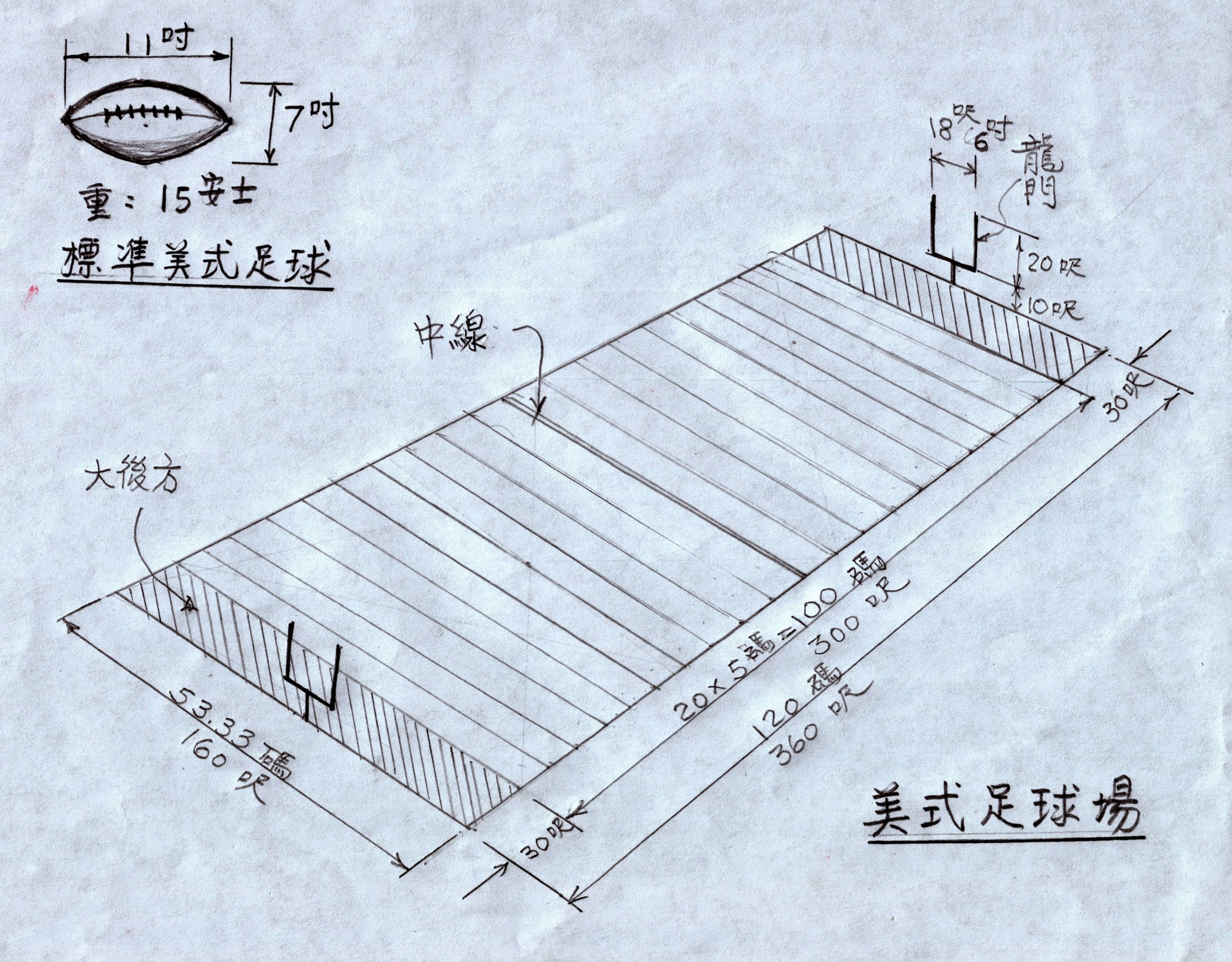 球場(圖一):足球的球場是 100 碼 × 53.3 碼的長方形球場。100 碼畫線分成二十等份,每線距離為 5 碼。兩頭豎起鐵杆龍門,距盡頭 10 碼,專為足踢射球而設。