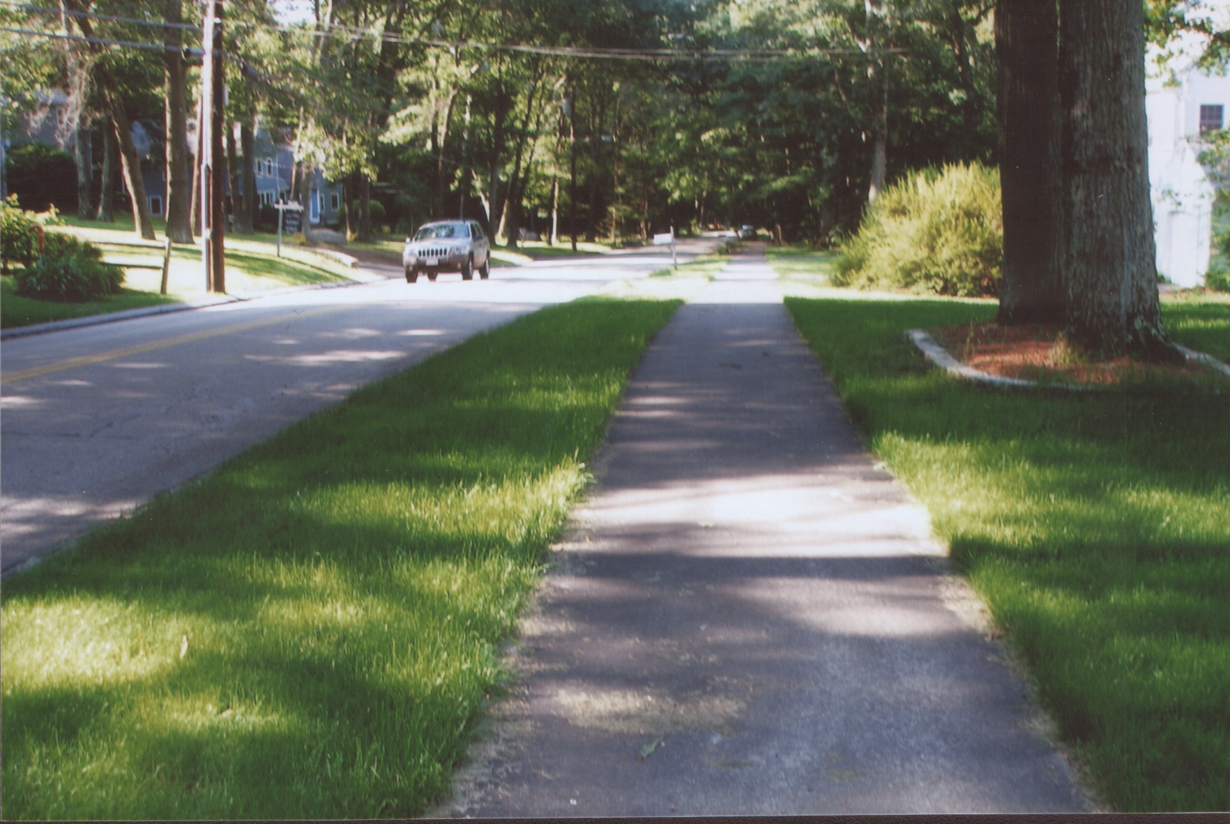 小鎮的道路並不寬敞,我想是保留百餘年前 的路徑吧。路兩旁都是合抱的大樹,綠蔭不斷,雖不能說是曲徑通幽,卻也說得上蜿蜒曲折。兩車道寬的路面,上下班時段,交通相當繁忙,不由得你為開車的捏一 把冷汗。還好道路一邊保留有行人道的小徑,讓一些行路的人和上下學的學生,可安心地在小徑上徜徉。