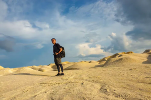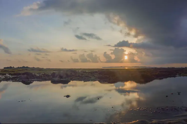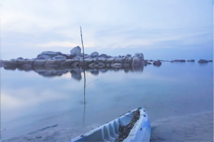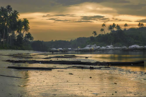 第二天早上四點半,我們又出發到 Teluk Bakau 海灘拍日出。清晨的海灘非常寧靜,遠方的天空開始漸漸發白,照亮了海平面,紅色雲彩也漸漸地染紅地平線。就在太陽露出臉龐的那一刻,一片烏雲飄過來遮住了它,然而陽光依舊衝破雲層,灑落大地。