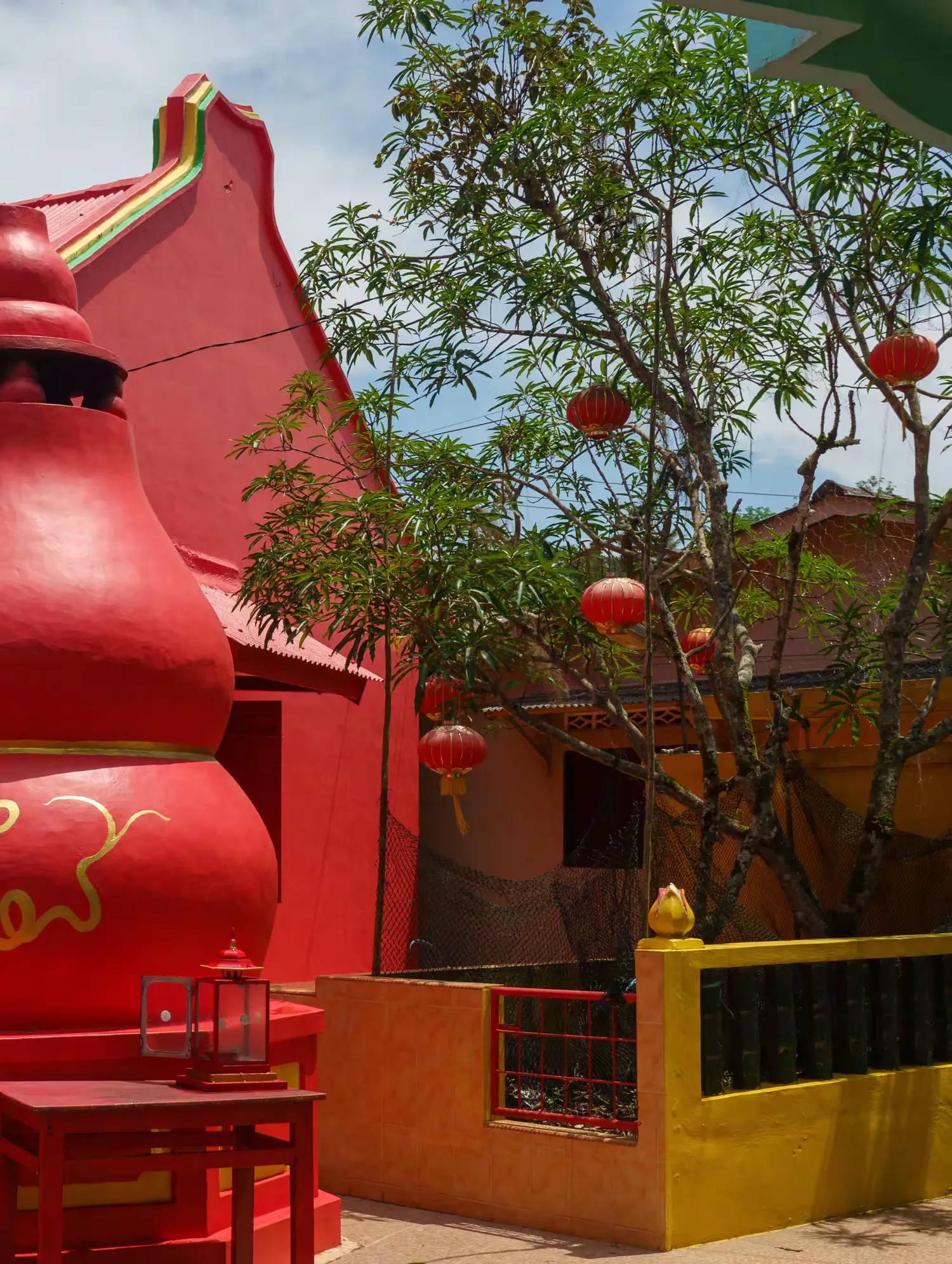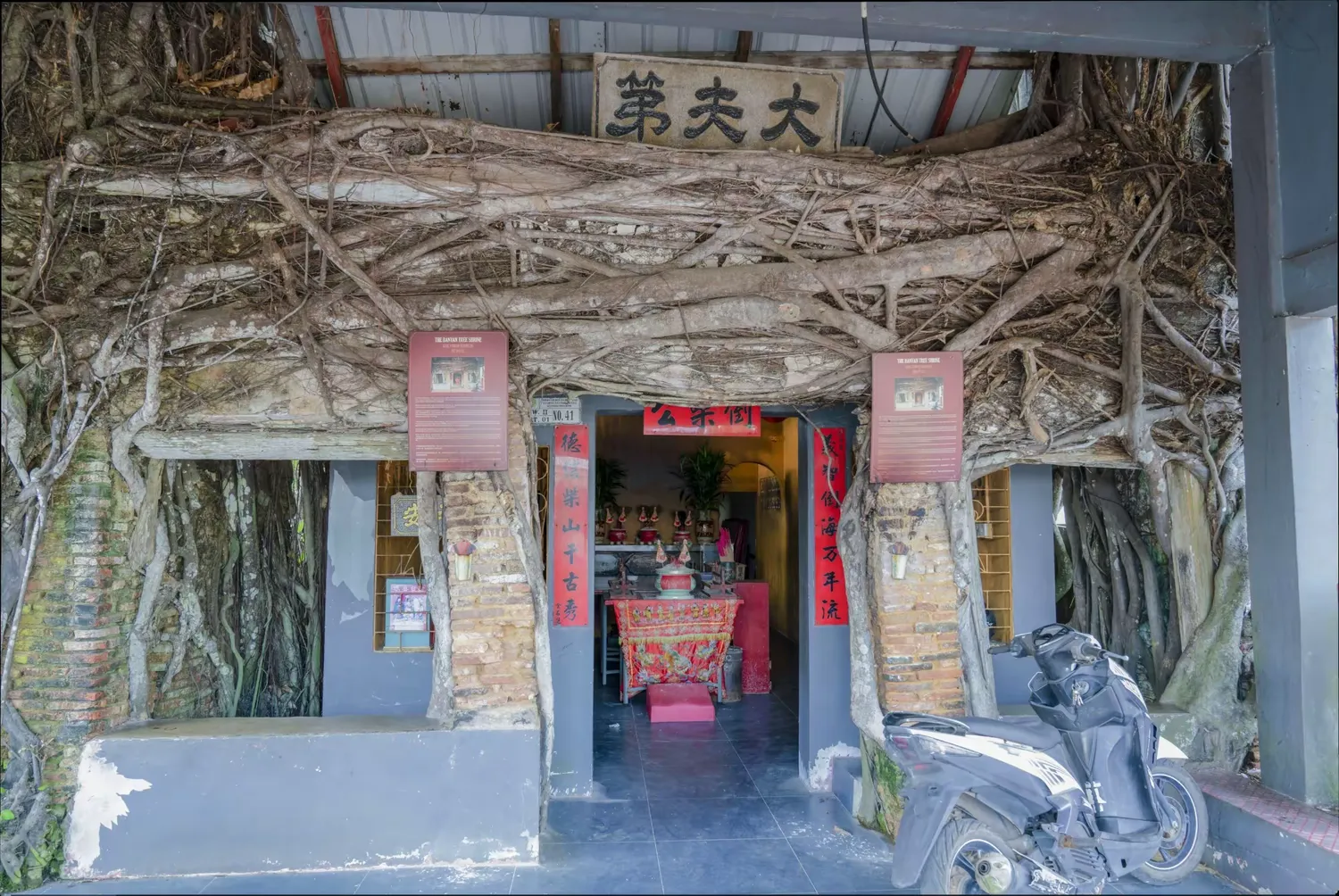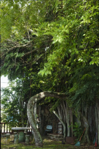 在去酒店的途中,經過了一處村莊。在其路口,看到一座完全被包裹在大榕樹根系內的廟,我們在此處做了短暫的停留。此村裡的高腳屋,都是環繞著海塘而建,其間也見到幾艘漁船停泊在岸邊。村裡還有一座華人廟。看廟的老先生告訴我們,他已經在此看廟看了三十年。我很驚訝他還會說華語,要知道在五十年代時,印尼政府就驅趕華僑、禁止華文華語的。在我以前工作公司內的印尼華人同事們,都是不會說華語的。