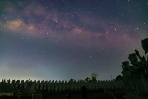 此處是拍攝銀河的首選之地。開始時,帶隊老師對我們這些小白們簡略介紹了怎麼對焦,怎麼設置,然後帶著我們熟悉了一下四周環境。廟裡面的羅漢都似真人般的大小石雕。拍攝銀河時,四周一片漆黑,別人的相機還可以在相機螢幕上構圖,而我的相機太「low」,僅僅只是對焦天空中最亮的星星就夠嗆了。前景完全看不到,只好盲拍後,看圖再調整鏡頭位置。好不容易固定一個機位元,勉強有一張顯示出銀河的軌道。最後在寺廟大門架著相機拍了約三十分鐘。有了星軌的模樣,雖然不怎麼樣,至少練習了手動對焦,對拍銀河和星軌有了一點概念和實操。原來銀河出現時間每天是不一樣的。這天銀河出現在十一點,拍攝結束已是凌晨十二點多。