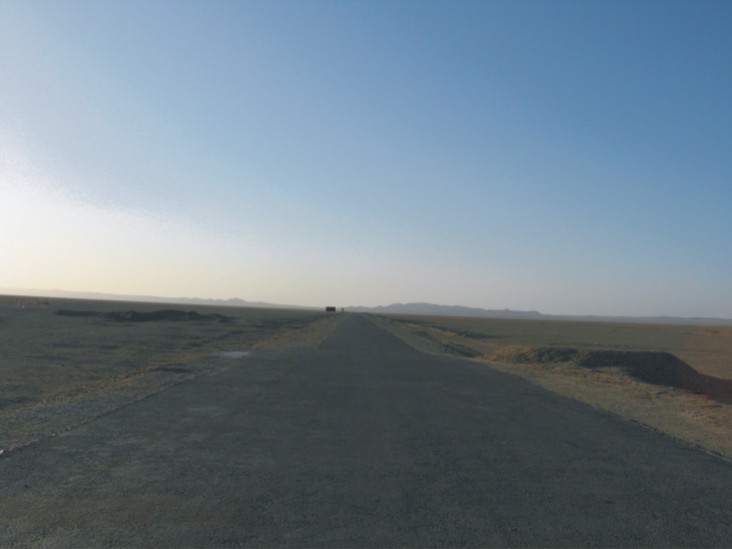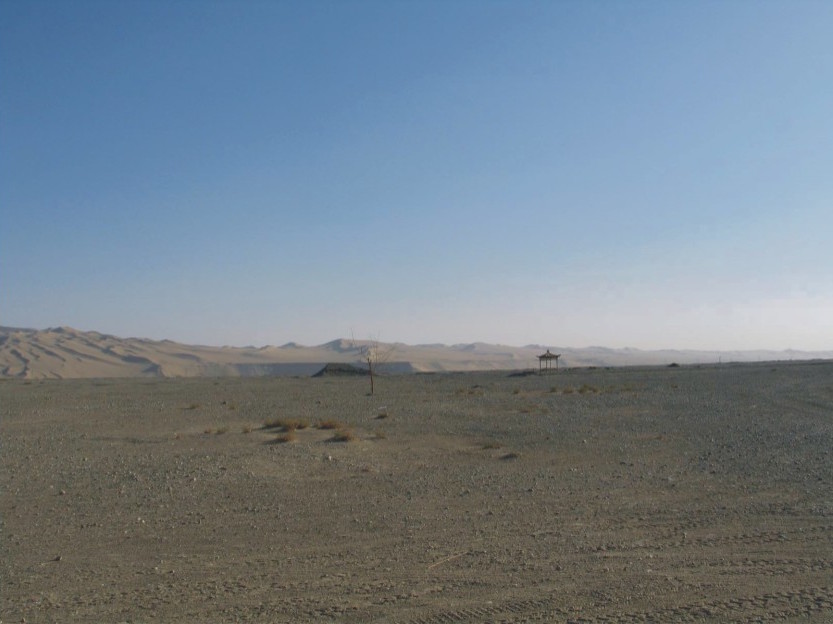 陽關距敦煌約七十公里。剛出城時尚可見到草木綠樹,接著就是黃沙遍野,再接著就進入了無垠無際的戈壁灘了。這時視野向前無限延伸,好像直奔洪荒,直奔地平線的終端,好像人兒回到了自我的孤獨與渺茫。