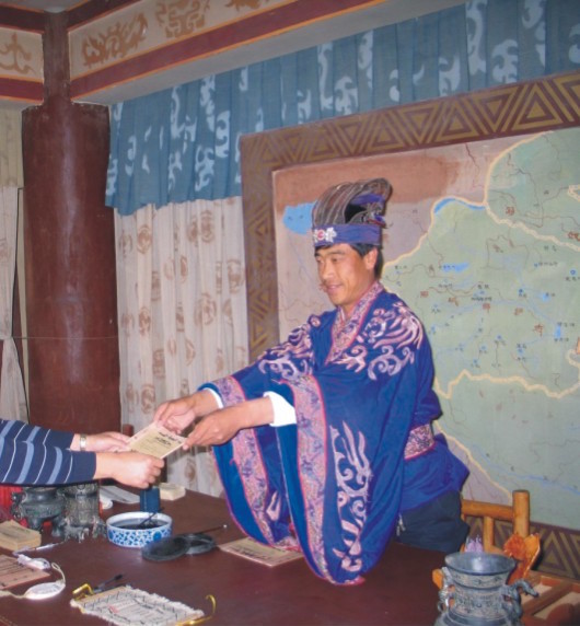 堂中還真的活生生地坐了一位身著官服的老爺,年紀不大面帶微笑。想必他就是冒牌的「司戶參軍」大人了。他背後左側牆上明碼標價地註明了不同款式的關牒,收取不同的費用。