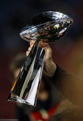 1969 年第三屆 NFL 年度決賽時,改名為:超級碗冠軍賽。該名稱由堪薩斯奠長隊老闆 Lamar Hunt 根據其女兒的玩具 Super Ball 創意而成,延用至今。由美聯會和國聯會在常規賽中分別角逐出各自的冠軍,於每年一月的最後一個或二月的第一個星期日,進行兩冠軍隊最後的決賽。勝者為當年的超級碗冠軍,贏得隆巴迪杯(Vince Lombardi Trophy)。該杯為紀念綠灣包裝工隊傳奇教練隆巴迪而命名。獎盃高二十二英寸,重七磅,手工打造,純銀製成,由蒂扶尼(Tiffany)公司出品,如圖三所示。超級碗比賽地點是由 NFL 所屬球隊的老闆們從申報候選的城市中投票決定。
