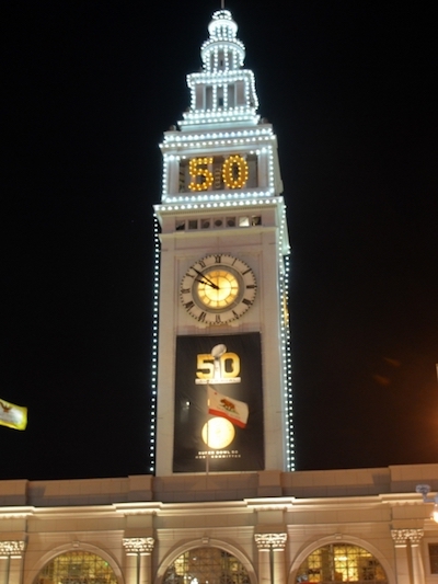 舊金山市輪渡碼頭鐘塔,是本屆超級碗的地標。塔頂有巨大「50」字樣的彩燈,大鐘下為隆巴迪杯居中的第五十屆超級碗徽標,下部有圓形的 2016 超級碗主辦委員會徽標,圓形徽標上飄揚著加州州旗。徽標由舊金山灣區藝術家 Michael Schwab 設計,圓形徽標取淺黃為底色,以舊金山市地標金門大橋為中心;從金門大橋外射的光芒代表灣區持續的創新精神;金門大橋中間的橄欖球預示:具有里程碑意義的第五十屆超級碗,將會是歷史上舉辦的最好的橄欖球比賽(圖四,圖五)。地處灣區,舉辦賽事的合作夥伴有谷歌、蘋果、雅虎……等十七家高科技公司。主辦委員會自 2013 年獲准舉辦盛會以來,共募集資金四千萬美元,並表示將以其四分之一回贈慈善機構,辦賽事既不差錢又有愛心。