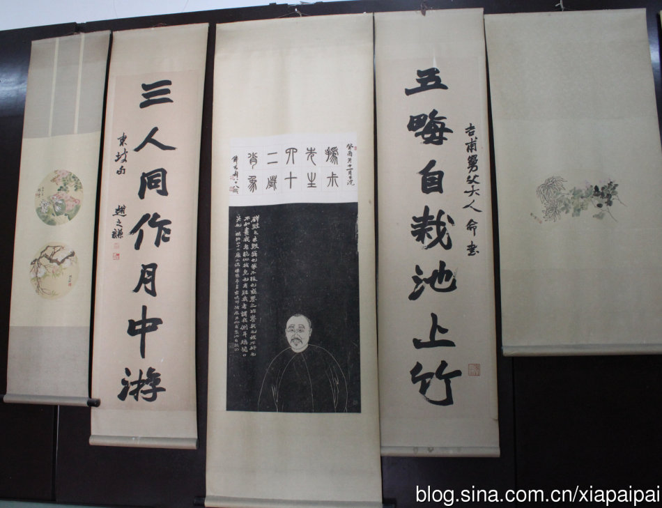 入內為一小室,四壁掛滿有關趙之謙先生的字畫作品。居中的石刻畫像,小時候見過,看上去好似從杭州西冷印社的石碑上拓來的。