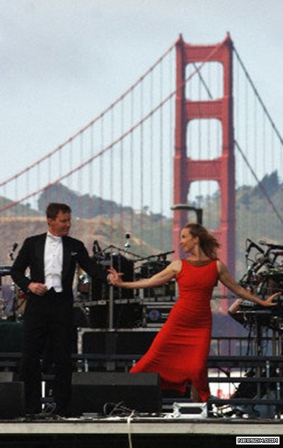 慶祝活動於上午十一時開始,有音樂舞蹈〔訴說橋下訂婚的甜蜜故事〕(圖一)。放煙火時大橋禁止車輛通行一小時。籌備會也為七十五週年橘紅色慶祝標誌(圖二)揭幕。
