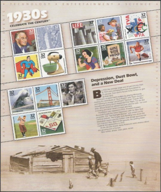 2﹒1998 年 9 月 10 日發行 1930 年代十五枚小全張(圖六),其中一枚為「1933 年金門大橋開始建築圖」(圖七),這是美郵唯一發行的金門大橋郵票,此票隱藏在小全張中,毫不起眼。不集郵的民眾,很少會買這種小全張,即令是郵人購買後也很少會撕下使用。因此,此枚金門大橋郵票雖然發行卻很少被人注意到,可說是「衣錦夜行」吧!
