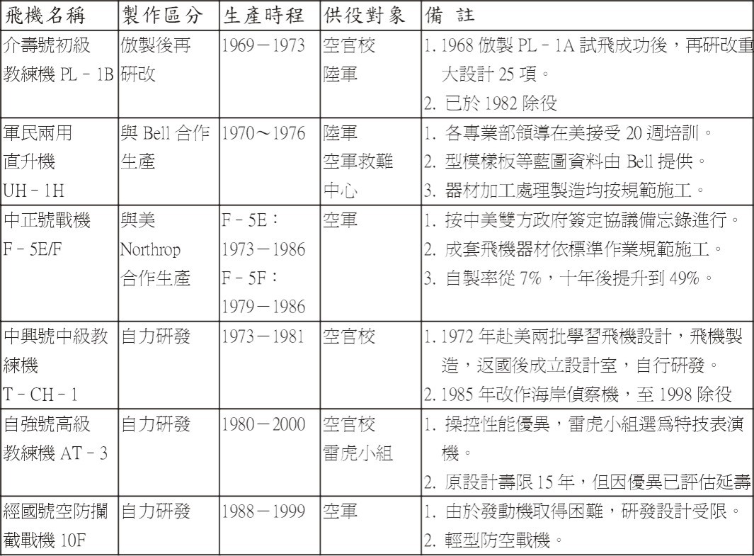 三﹒製造出廠飛機有合作生產之 UH-1H 直升機與 F-5 E/F 戰機,及自製之初、中、高三種教練機與空防戰機。各型飛機均量產五十架以上供應部隊。請參考附件一。
