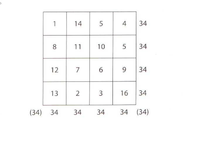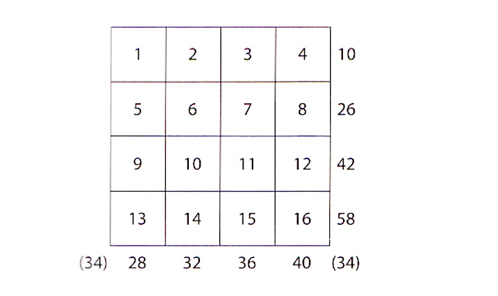A.四階魔方:以 1 到 16 的十六個連續數,放在每邊四格的方陣中,要使豎的每行,橫的每列及兩對角線上四數的和,皆為 34。