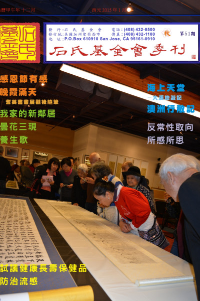 入冬後連朝陰雨,氣溫徘徊在華氏五十度左右,就北加州舊金山灣區來說,是個不適合外出的天氣,但石氏基金會籌辦的「耆英書畫展」,於元月九日在聖荷西展出時,卻是藍天一片[...] Read More »
