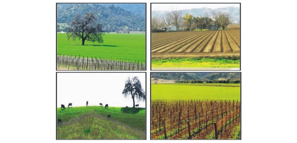 農家 綠草茵茵天藍藍, 紅白樓房映群芳。 加州農家好景色, 一片靜謐與安詳。
